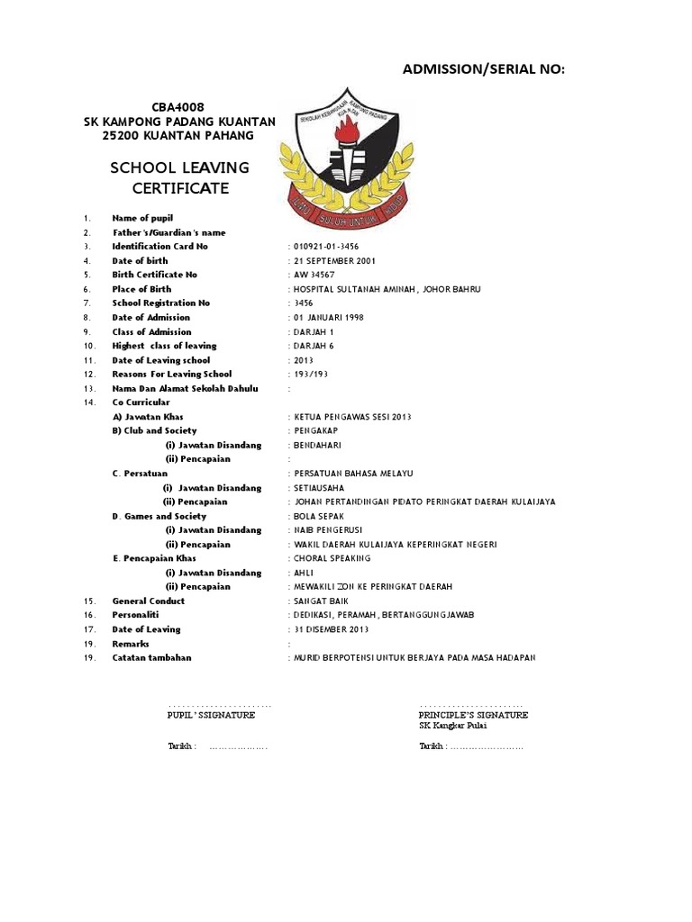 . 14092021 14092021 20042022 Sijil Berhenti Sekolah Online - Sijil Berhenti Sekolah Versi Inggeris Pdf By najwagenta62 April 20 2022 Post a Comment Seorang bekas. Contoh sijil berhenti sekolah tahun 6 2021. CHAI ONN SANG 3.